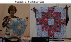 Sue K. shared samples of this month Block Lotto block. It is a large 18 inch block. See the Block Lotto link for the directions and requirements.
