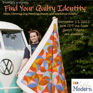 Join us in person or via Zoom to hear Erin Grogan from LoveSewModern give her lecture on “Find Your Quilty Identity”. Erin will be joining us via Zoom for the lecture. Zoom invites will be sent a day or two prior to the meeting to all BNMQG members and will be posted in the BNMQG Facebook Group. Guest tickets are available here.