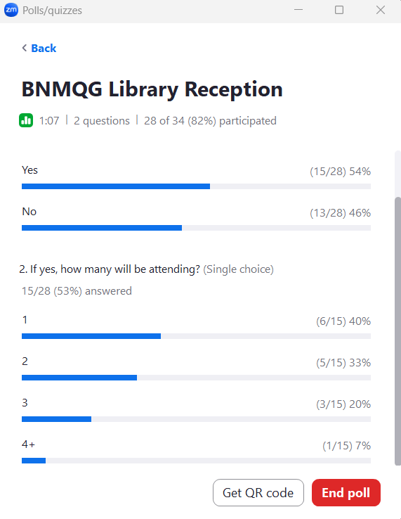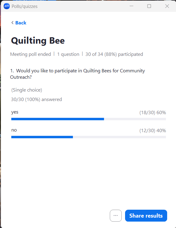 The exhibit of our Modern Minis at the Bloomington Public Library begins March 7 with a Reception from 1:30-3:30 pm. The opening reception is Saturday, March 7th from 1:30-3:30 pm, and is open to the public. Nancy P will notify participants about when she needs the quilts. To estimate how much food is needed at the reception, a poll question was asked. Are you planning to attend the BNMQG Library Reception at the Bloomington Public Library on March