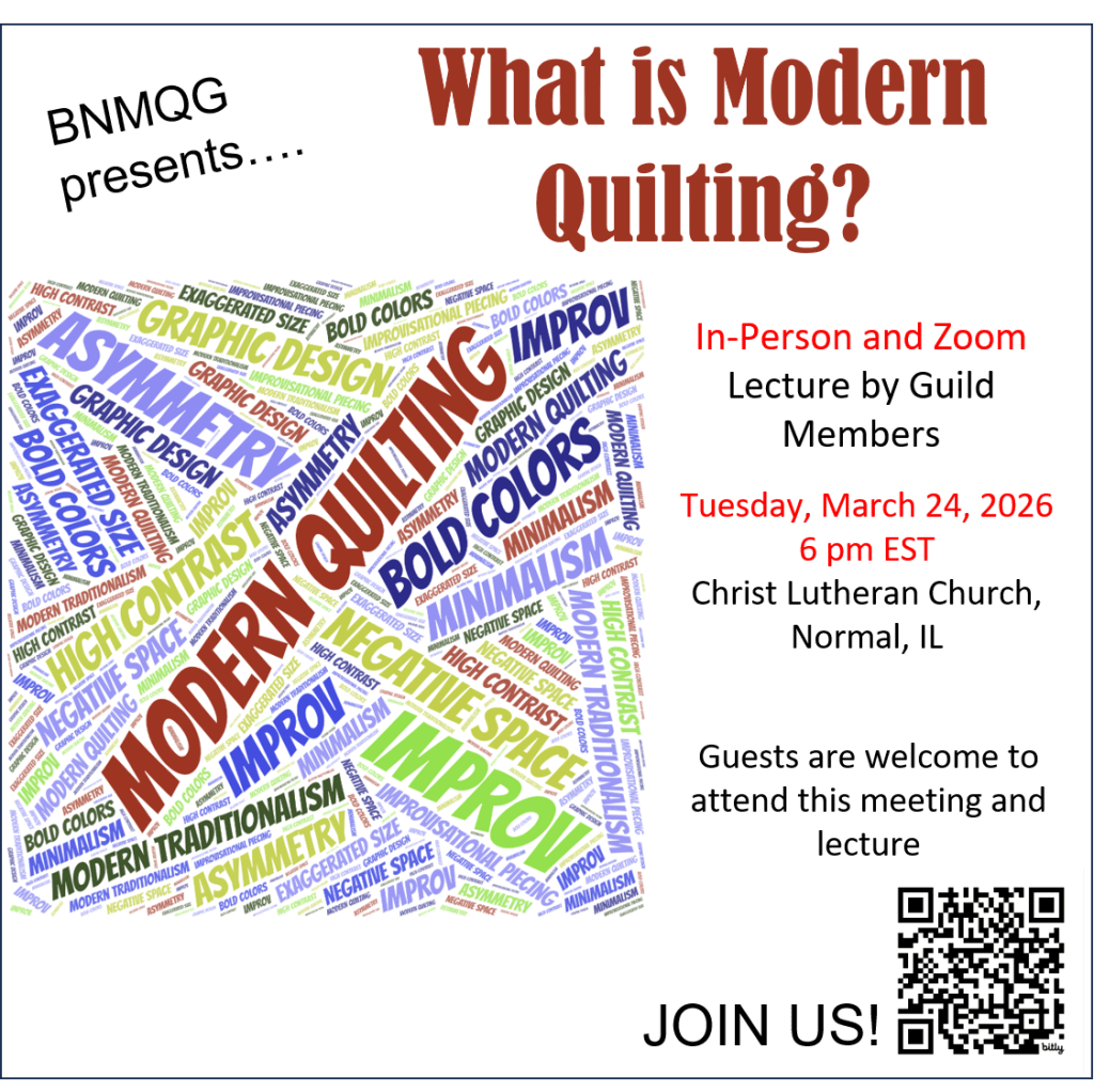 “Modern Quilts are primarily functional and inspired by modern design. Modern quilters work in different styles and define modern quilting in different ways, but several characteristics often appear which may help identify a Modern Quilt. These include, but are not limited to: use of bold colors and prints, high contrast and graphic areas of solid colors, improvisational piecing, minimalism, expansive negative space, and alternate grid of work. Modern Traditionalism or the updating of classic quilt designs is also often seen in modern quilting.” This meeting will explore modern quilting via 2026 quilts from this year’s QuiltCon!